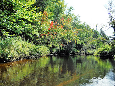 Oct 5, 2014 - UPPER KUNJAMUK RIVER. From Old Route 30 6.2 mile drive on Fly Creek Rd, a fair dirt road in the Speculator Tree Farm. Drove past the Long Level Bridge to a gate near where there used to be a bridge across the river. Breezy & temp barely reached 50F. Paddled upstream 1.4 miles, going over 4 beaver dams, to old fish barrier dam (now on state land), not maintained by humans but beavers have helped keep it up, a campsite & jeep road to the W. Paddled around the shallow 1.3-mile-long flow above the dam, many white pines along the shoreline. Saw lots of ducks, a gaggle of geese, 2 otters, a northern harrier & a beaver on top of his lodge. Had trouble finding the KR upstream in the marshy area to the NE. Returned past my put-in & went 1.3 miles further downstream going over one beaver dam & turning around at another. Views of the cliffs on Upper Pine Mtn close-by to the E; Doug & East Mtns prominent to the SW. River here is fairly deep & 20' to 30' wide with lots of backwaters. Shores are varied, very scenic area - I need to explore more of the river from here down to Elm Lake. 8.2 miles, 4.5 hours. Camped at Mason Lake (limited primitive camping, most of the old on-water campsites have been closed, map) - saw an adult loon & one juvenile, no sounds other than owls. Could hear logging activities early Monday morning.