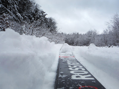 Monday Feb 7 - Started out with skins on the red hiking trail but soon went off-trail toward Rattlesnake Cobble thru open hemlock woods. Crossed brook. Gained 600'. Good view from The Narrows overlook. Took off skins & skied up the road past the other 2 lookouts, 5 snomos went by (if I had done this on the weekend it would have been 50 snomos). Dropped down to old woods road - very nice skiing with 12" powder on some base. Steep drop then moderate before becoming steep again - fun stuff - 600' drop in over a mile. R on the secret trail which had snowshoe tracks - just a hint of stickiness with temp riding to freezing. 3.4 hours. 4th day of skiing in 4 days.