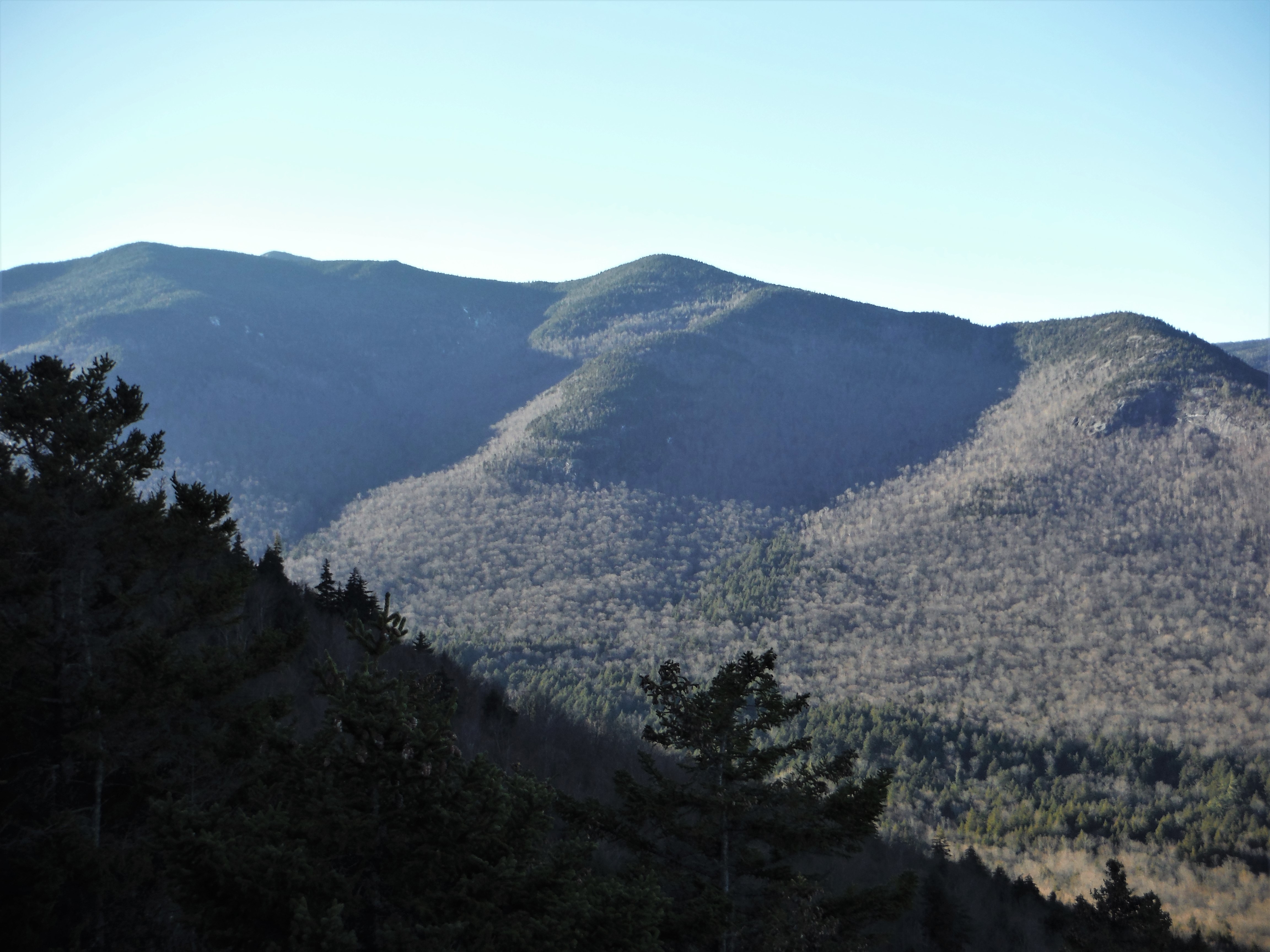 Dec 17, 2021 - The morning was spent shopping for Nordic bc gear. Started hiking at 1pm from Rt.73 & crossed a narrow bridge (no handrails), soon at a pond/reservoir, then reached state land in the High Peaks Wilderness area. Start climbing moderately with some switchbacks & stone steps. R at a junction. R at another junction at the 2-mile mark & passed around some erratics. More switchbacks to a junction. Went R 0.1 miles down to a ledge with valley views plus The Brothers & Hurricane Mtn. Back to the junction & another 0.3 miles to the summit - several views of Giant Mtn along the way - the last bit is very steep & there are some wood steps at one point. Not much time to enjoy the views & quite windy, temp in the upper 30s. Back down the same way, sunset 4:20pm, got back to the car at twilight 4:50pm - any later & we would have had to pull out the headlamps. No snow up to this 2,762' summit, some small patches of ice up high, a few small muddy spots, mostly dry trail - the spikes stayed in the pack. 5.4 miles, 1,837' gross el gain, 3.8 hours.