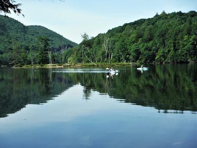 Paddling downstream, to the right from the boat launch, one immediately notices how the river cuts through steep forested hills on both sides - the Palmertown Range rises on the right, and the Luzerne Mountains (including the West Mountain ski area) to the left.